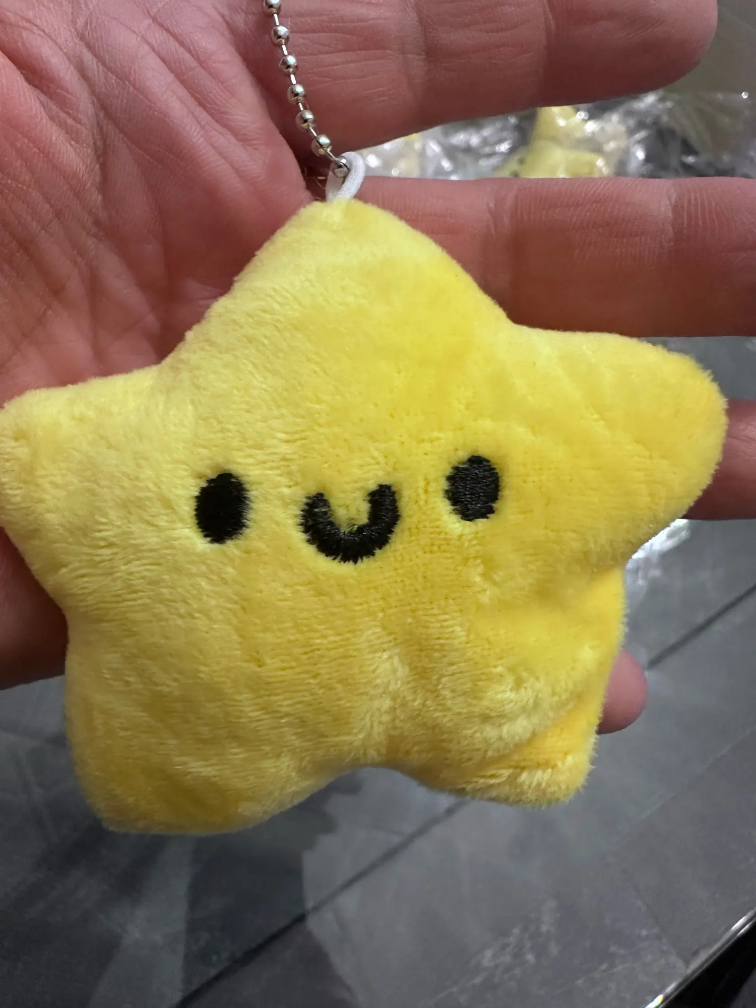 This soft yellow star plush keychain features a cute smiling face and a squeezable design.